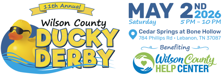 The Wilson County Help Center’s 11th Annual Ducky Derby will take place on Saturday, May 2, 2026, from 5 PM to 10 PM at Cedar Springs at Bone Hollow, located at 784 Phillips Rd, Lebanon, TN 37087. Guests will enjoy dinner, live auctions, and live entertainment. Tickets to attend the event are $125 each. Duck tickets will be available for $10. More details about the event will be added soon.